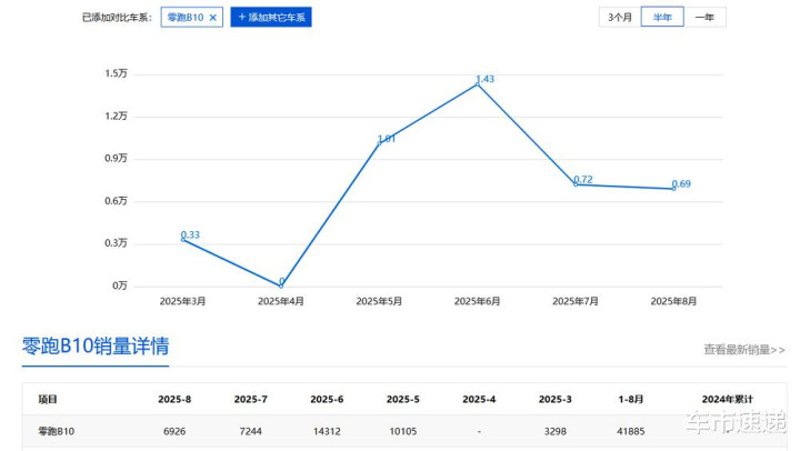 根据公开的单车型销量显示,零跑B10上市前的3月销量为3298台,上市当月也就是4月销量没有显示,5月销量10105台,6月销量升至14312台,7月销量下滑到7244台,8月销量低至6926台。从该车销量走势来看,6月销量升至高位后,接下来就开始出现了走低的苗头。